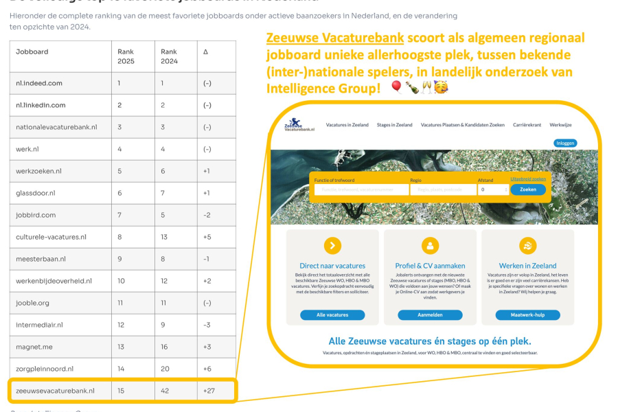 De Zeeuwse Vacaturebank scoort tussen alle grote (inter-)nationale spelers de hoogste plek van de algemene regionale jobboards!